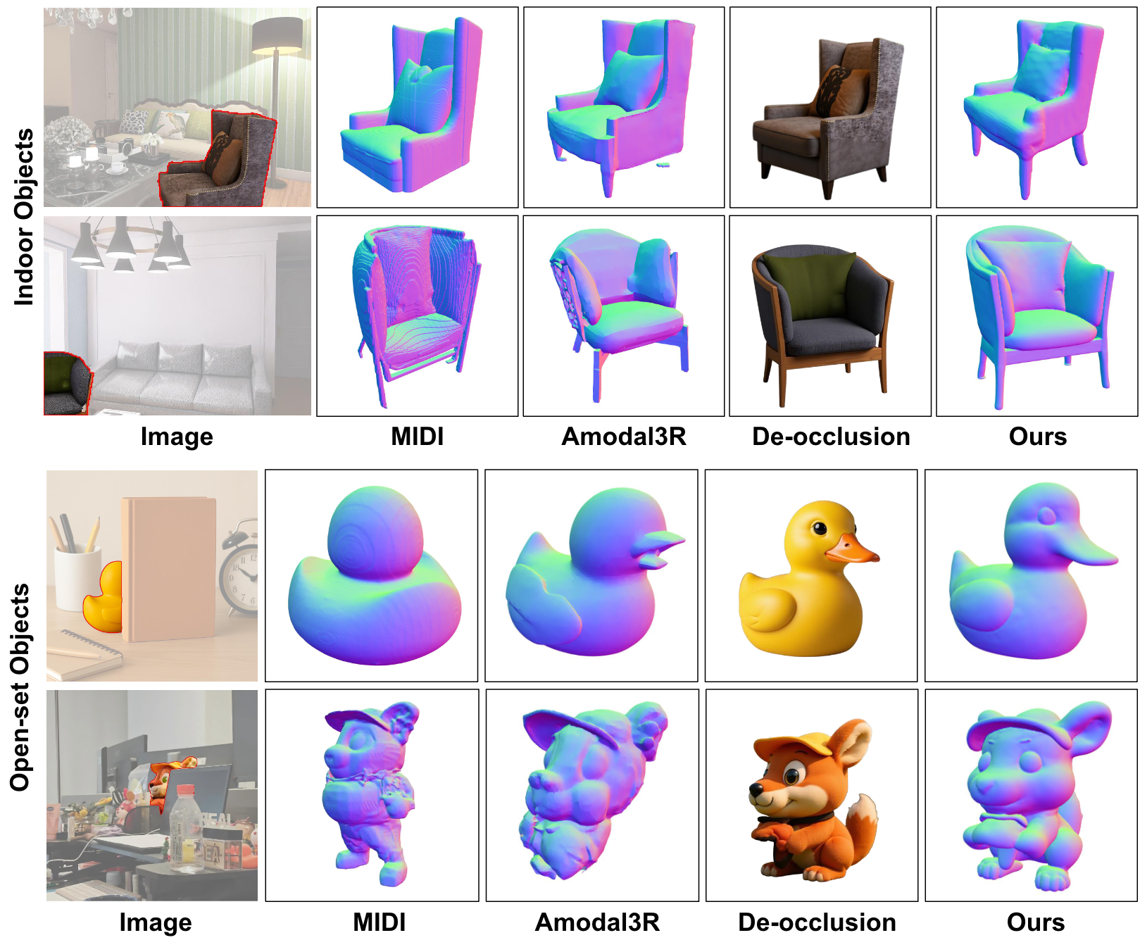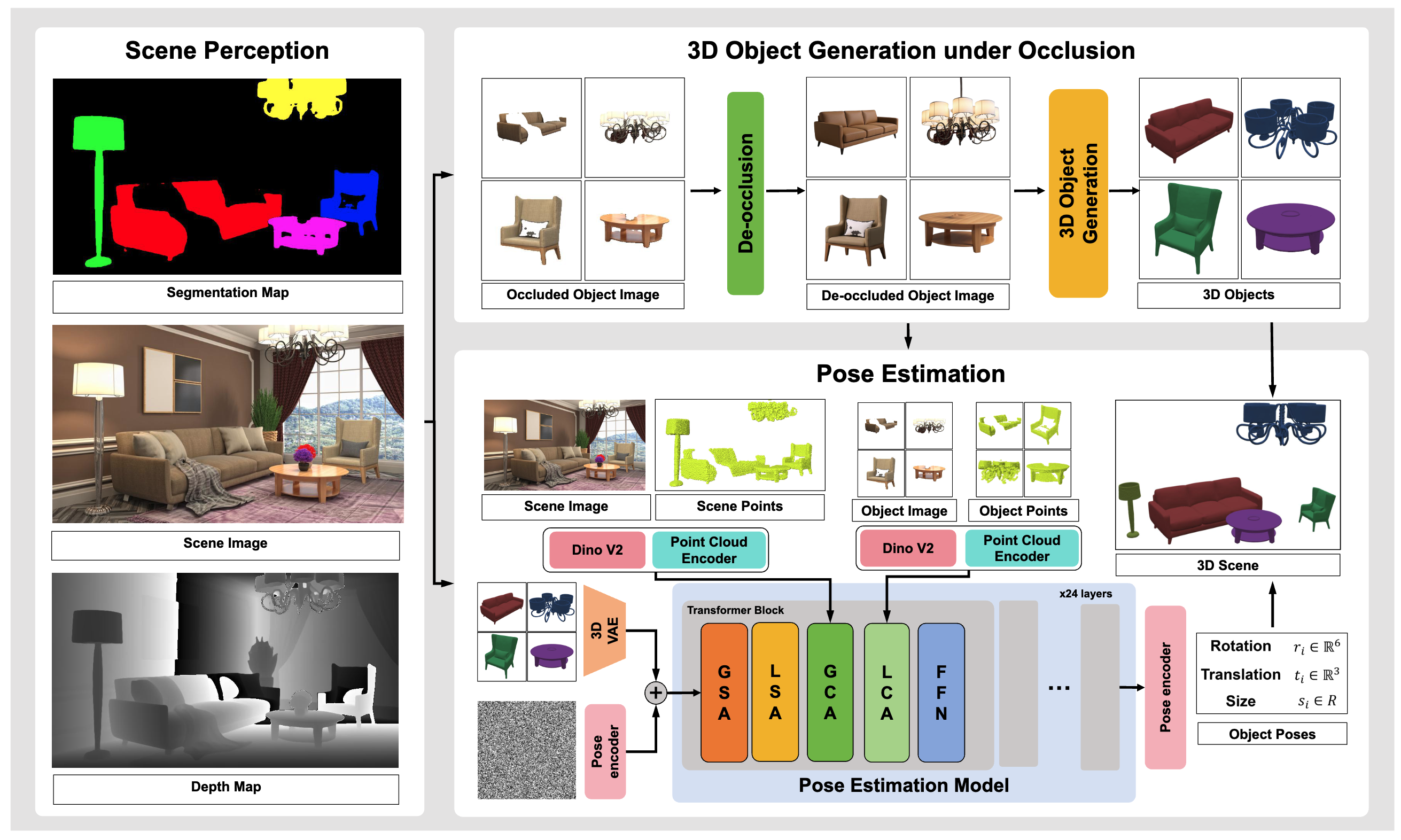 Our framework consists of scene perception, 3D object generation under occlusion, and pose estimation. We decouple the de-occlusion model from 3D object generation. We construct a unified pose estimation model that incorporates both global and local attention mechanisms.